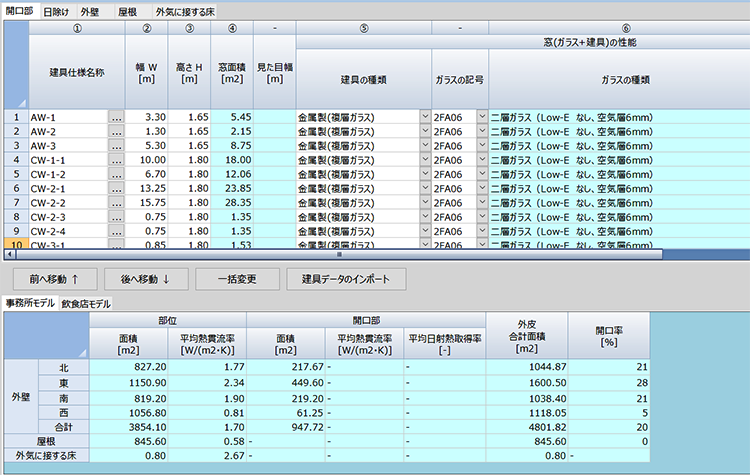 外皮仕様画面では作図画面で作図した外皮情報を自動集計します。