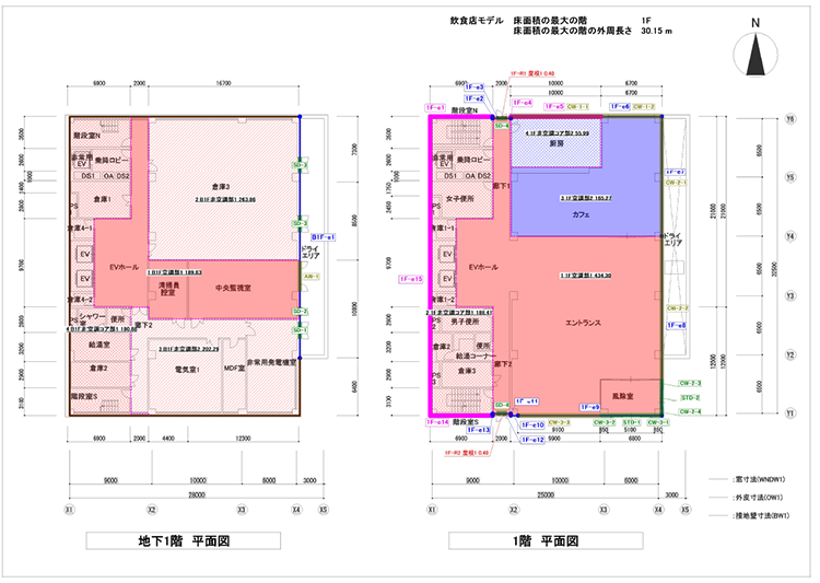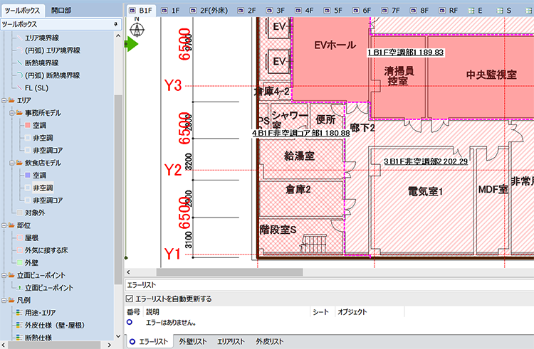設計図書を下絵として読込み、外皮情報を作図します。線情報・エリア情報が色分けされ判別が容易です。
